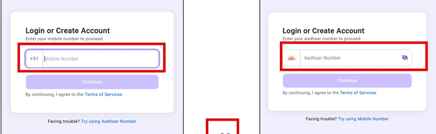- Step 03: Enter Mobile Number OR Aadhaar Number and click Continue.