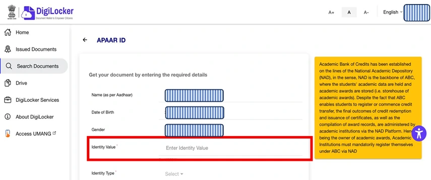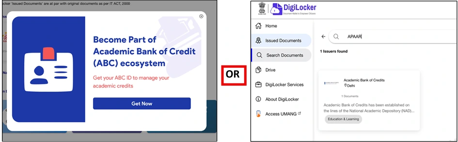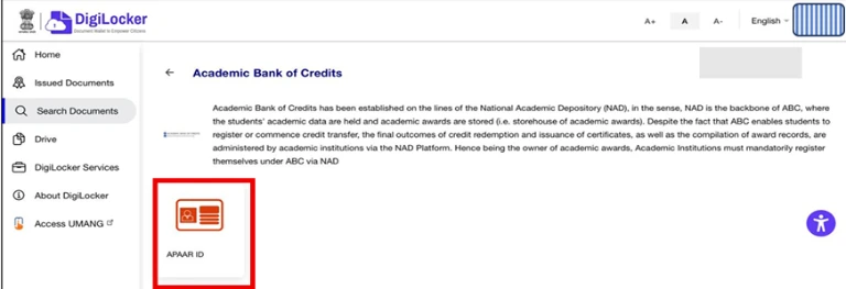 - Step 05: Once Logged In, Click on “Get Now to Get APAAR ID” OR Click on Search Document, and Search “APAAR” and click on “Academic Bank of Credits”.