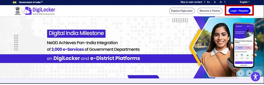 - Step 01: Visit the DigiLocker Portal at https://www.digilocker.gov.in/